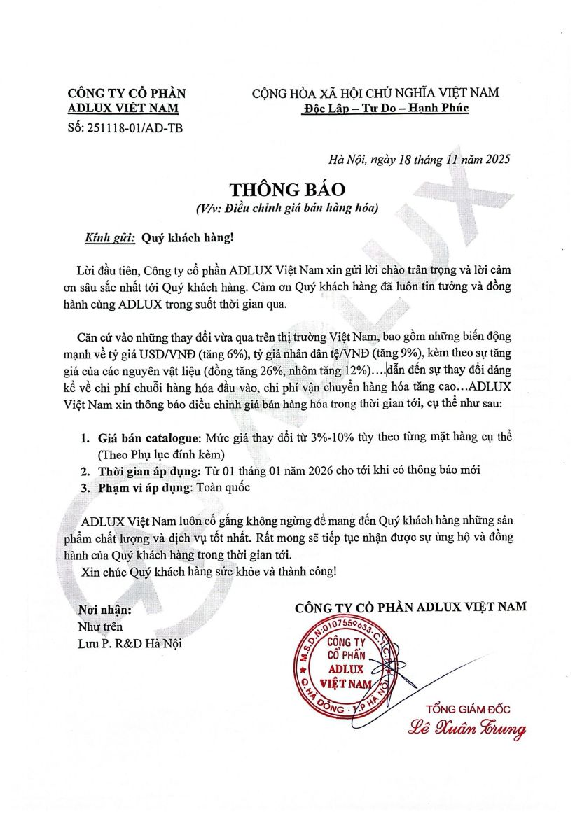 THÔNG BÁO ĐIỀU CHỈNH GIÁ BÁN HÀNG HÓA - ADLUX VIỆT NAM